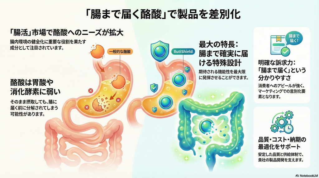 ■ ButiShield™の最大の価値:「腸まで届く酪酸」という、明確で強い差別化ポイント