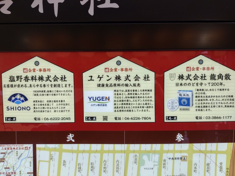 この度、私たちが拠点を置く「薬のまち」大阪・道修町のシンボル、少彦名(すくなひこな)神社に新しく設置された総合案内板に、弊社の広告が掲載されました.