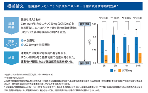 L-カルニチン(製品名:Carnipure®カルニピュア )は2002年厚生労働省より食薬区分での使用を認可された栄養素材であり、エネルギー源としての長鎖脂肪酸をその燃焼の場であるミトコンドリアに運搬する必要不可欠な栄養素です。この届出受理は日本人を被験者とし、L-カルニチンの基本機能である脂肪燃焼について改めて証明した結果に基づいています。根拠論文中にあるCarnipure®の単回摂取後の脂肪燃焼効果による有意差からは、多様化された現代の生活ニーズに適合するダイエット素材として、細胞レベルでの効果が期待されます。従来のスポーツニュートリション分野での効果のほかに、生活習慣病予防分野でご検討頂ける素材として、情報提供の準備が整っております。