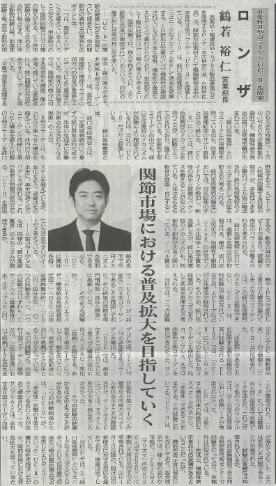 当社としては、①「経口免疫寛容」というユニークなメカニズム、②「1日40mg」という低用量、③「30超の12報の臨床論文」といった「UC-II」の優れた特性を訴求しながら、関節市場における普及拡大を図っていきたいと考えている。