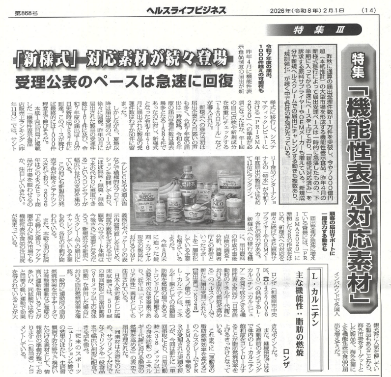 ロンザ株式会社が提供する、世界シェアトップクラスのL-カルニチン原料「Carnipure®(カルニピュア)」が、2026年2月1日発行の専門紙『ヘルスライフビジネス』の特集「機能性表示対応素材」において、注目素材として大きく取り上げられました。健康志向の高まりとともに、より具体的かつ科学的根拠に基づいた「体重・体脂肪管理」が求められる中、本特集ではCarnipure®の最新エビデンスと、その圧倒的な品質水準が評価されました。
