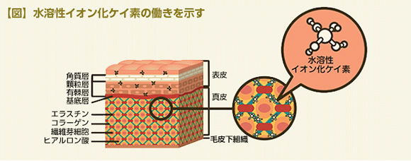 コラーゲン束ね、バリア機能発揮。ナノ浸透水溶性イオン化ケイ素。水晶・富士山湧き水由来、特許出願済。