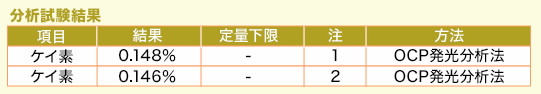 水溶性イオン化ケイ素1mlに、イオン交換水100mlを加え、1分間攪拌後30分間静置した液を分析。また、同じ状態の液を、200nmのフィルターで濾過した液も分析した。その結果、表のように200nmのフィルターを用いていない(注1)と、200nmのフィルターを用いた(注2)とが、両方ともほぼ等しいケイ素測定値を示した。