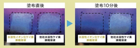 「水溶性イオン化ケイ素」と市販の水溶性ケイ素の比較による浸透試験も行われている。51歳の男性を被験者とし、右前腕内側に、それぞれ塗布。10分後の変化を確認した。