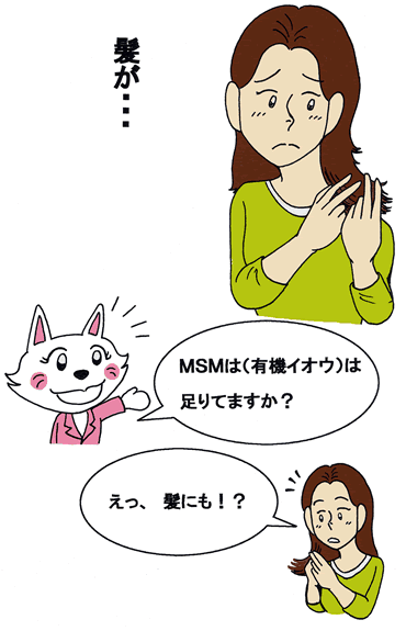 MSM(有機イオウ)は、ケラチンの合成を促進させ、髪の健康と美容をサポートします。