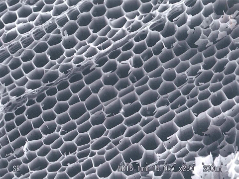 炭(チャコール)の元原料である草木類には、根から水分や栄養を吸い上げる道管が走っており、炭にするとミクロの孔に姿を変えます。この無数の孔が吸着力に大きな影響を与えます。細孔が発達した構造を「多孔質」と言い、炭粉末1g当たりの比表面積は、テニスコート数面分にも及び、不要な物質を吸着します。