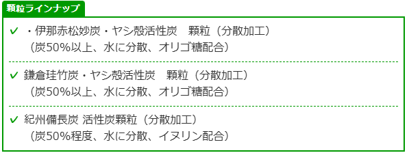 ラインナップは計3種。特性の異なる機能性食用炭微粉末と天然オリゴ糖ラフィノース・水溶性食物繊維イヌリンを配合した分散加工品タイプが2種。紀州備長活性炭と水溶性食物繊維イヌリンを配合した分散加工品タイプが1種。舞わない・飛ばない顆粒、かつ水に分散しやすいよう仕上げました。