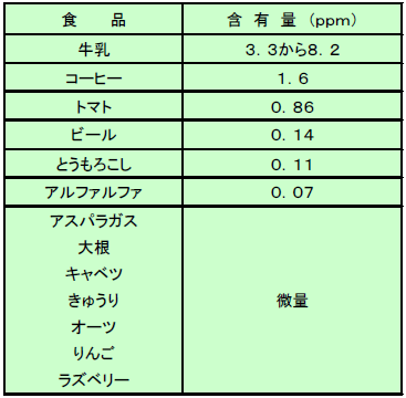- お茶、コーヒー、トマト、ビールなどの一般的な食品にも含まれ、中でも牛乳に一番多く含まれていることが知られています。