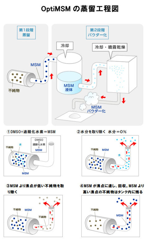 - OptiMSMは、それらの不純物を沸点の違いにより取り除くことができる蒸留法によって精製されています。