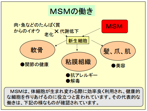- MSMは、人間の体内にも存在する物質で、毒性も無く、副作用もほとんど報告されていません。充分に安全性が調べられています。