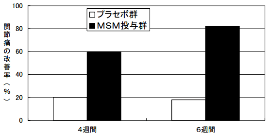 MSMの摂取は、変形性関節症の患者さんの自覚症状を著しく軽減しました。 被験者は、平均的に摂取後3から4週間で痛みの軽減を自覚。