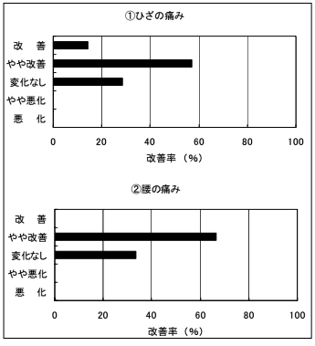 - 披験者の10人中7人がひざの痛みを、6人が腰の痛みを訴え、その約7割の方の関節の痛みが緩和した結果が得られています。