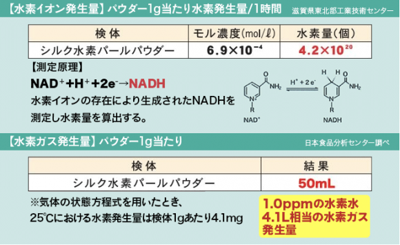 シルク水素パールパウダーでは、多孔質構造を持ち、アミノ酸が豊富なシルクフィブロインパウダー(シルクプロテイン)と海洋深層水ミネラル、水素とのコラボレーションを実現。さらに、真珠貝由来ハイドロキシアパタイトに独自の水素加工を施すことで、水素ガス・水素イオンの双方を発生 させる“ハイブリッド”水素原料(食品用・酸性)をつくり出した。
