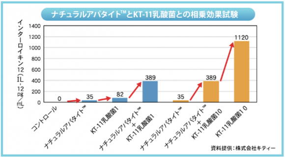 真珠貝由来のハイドロキシアパタイトは乳酸菌との相乗効果で免疫細胞が生み出す免疫活性インターロイキン12を大幅に増加することが確認されている。
