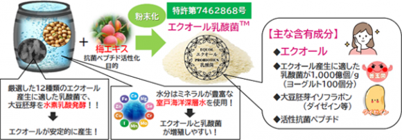 実際に、「エクオール乳酸菌™」の製造プロセスで、大豆胚芽を「水素乳酸発酵」という独自の製法で発酵させており、これがエクオールを安定的に産生するキーとなっている。