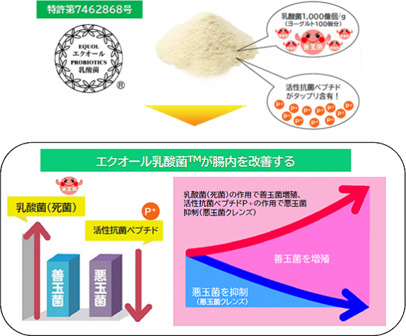 エクオール乳酸菌™中の乳酸菌(死菌)は腸内の善玉菌を増殖させ、エクオール乳酸菌™中の活性抗菌ペプチドは腸内の悪玉菌を除菌抑制(悪玉菌クレンズ)する。それにより、腸内フローラを改善させる。