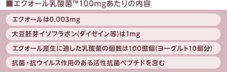 エクオール乳酸菌™の推奨摂取量は100mg/日。より好ましいのは1日に100mg/回×3回だ。