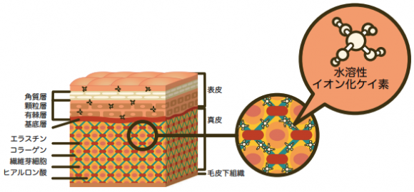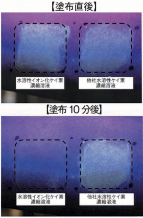 塗布10分後の結果は、「水溶性イオン化ケイ素」の試験区においては、蛍光剤の発色は認められず、「市販の水溶性ケイ素」の試験区のみが蛍光発色が認められた。このことから、「市販の水溶性ケイ素は、皮膚上に蛍光剤が残存していたことから、皮膚浸透現象が起きていないと考えられる一方、「水溶性イオン化ケイ素」は、蛍光剤の残存発色がないことから、肌への浸透が起きたと考えられる。水溶性ケイ素は、コラーゲン等と結びつき、皮膚の隙間を埋めて弾力を保つ役割を果たしている。ただし、水溶性ケイ素そのものでは肌に浸透しにくいため、特殊加工により浸透率に優れた「水溶性イオン化ケイ素」を実現した。これにより、浸透率が高くなり、肌の活力を取り戻したり、肌の再構築が可能となったりするなど、さらなる効果が期待できる。