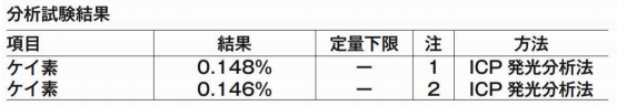 第三者機関を介して、水溶性イオン化ケイ素について、フィルター通過試験を行った。すなわち、水溶性イオン化ケイ素1mLに、イオン交換水100mLを加えて、フォースミルで1分間撹拌後、30分間設置した液について試験した。結果は上の表の(注1)である。また、水溶性イオン化ケイ素1mLに、イオン交換水100mLを加えて、フォースミル1分間撹拌後、30分間設置し、200nmのプランフィルターでろ過した液について知見した。結果は、上の表の(注2)である。
