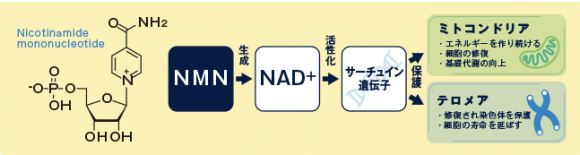 その活性化に重要な役割を果たすのが、NAD+という補酵素だ。直接体内に摂取することができないこのNAD+は、その前駆体であるNMNを摂ることではじめて体内で合成される。従って、NMNを摂ることだけが、サーチュイン遺伝子の活性につながることになる――。