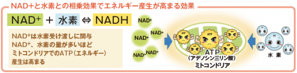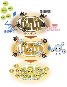 加齢に伴い、代謝が低下した状態でNAD+で活性化されたミトコンドリアがエネルギー産生時に作り出してしまう火星酸素を高濃度水素が速やかに消去して参加を抑制する。