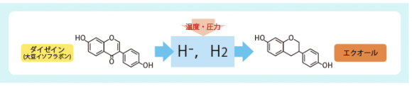 「エクオール」は、大豆イソフラボンの女性ホルモンに似た作用の源と考えられており、女性の更年期障害の緩和や男性の薄毛・前立腺肥大への効果が報告されているが、自然下では日本人の2人に1人しか腸内産生できない事が知られている。