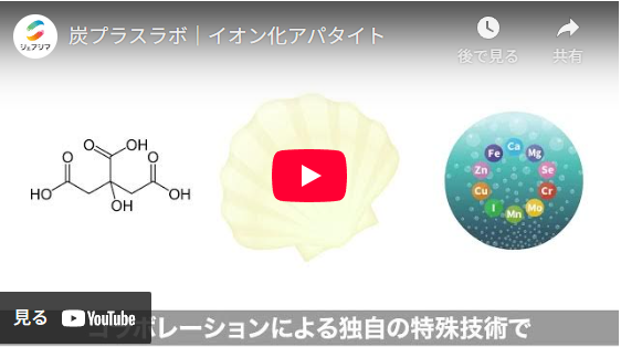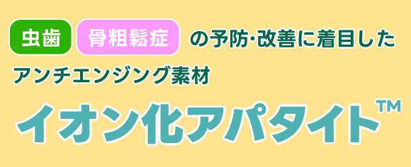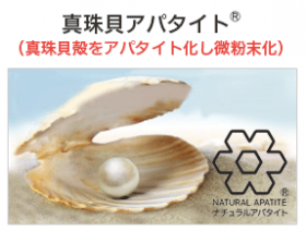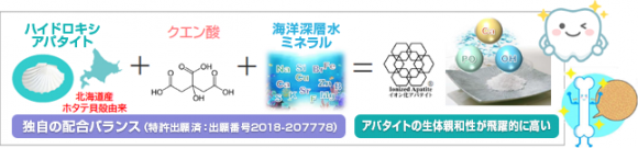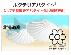 一般に流通しているアパタイトのほとんどは鉱物(消石灰)由来。だが、「イオン化アパタイト™」は、北海道産ホタテ貝殻由来のアパタイトを使用する。 ホタテ貝殻は海のミネラル分を含んだアパタイトで形成されており、鉱物由来に比べて、より生体親和性に優れる。