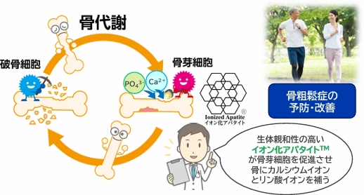 このように普通のアパタイトに比べ、イオン発生量を多くしたことで生体親和性を高めた「イオン化アパタイト™」は、骨形成に関しても歯の修復時と同様に、カルシウムイオン、リン酸イオンが骨形成にむかうことで、骨粗鬆症の予防・改善につながるのだ。