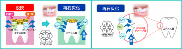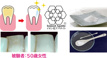 またイオン化アパタイト™に含まれるクエン酸が口腔内において唾液の分泌も促すため、唾液中に含まれるカルシウムイオンとリン酸イオンも歯のエナメル質修復の材料になる。