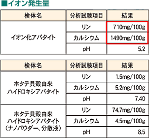 イオン化アパタイト™では、リン、カルシウムのイオン発生量がホタテ貝殻由来のハイドロキシアパタイト単体との比較で、300倍前後の差があり、圧倒的な違いがある。