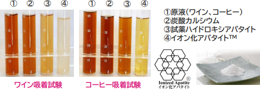 イオン化アパタイト™は、歯に色素沈着したワインやコーヒー等の色素を吸着して除去する作用がある。