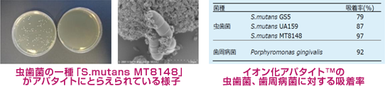 更にイオン化アパタイト™は、代表的な虫歯菌や歯周病菌を吸着除去することもできる。