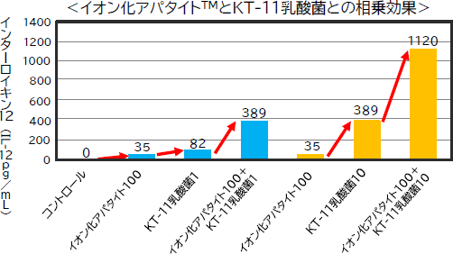 免疫細胞にイオン化アパタイト™とKT-11乳酸菌(クリスパスタ菌)を加えた実験では、免疫細胞が産み出す免疫活性インターロイキン12(IL-12)が大幅に増える結果となった。IL-12は免疫賦活や抗アレルギー作用を導くサイトカイン(情報伝達物質)。