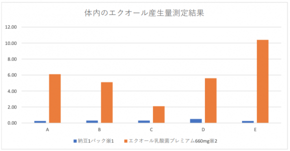 ※2 A~Eの5名が「エクオール乳酸菌プレミアム」を夕食後660mg摂取し翌朝採尿した結果