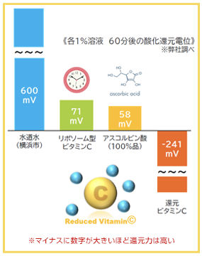 また、還元力は「アスコルビン酸(100%品)」や「リポソーム型ビタミンC」の5倍以上だ。このことにより、既存のビタミンC原料よりもビタミンCの機能性を高めることができる。