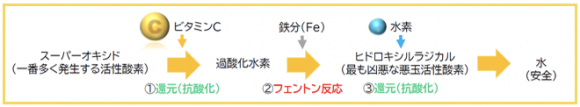 ビタミンCは活性酸素である「スーパーオキシド」を還元(抗酸化)するが、同時に「過酸化水素」を発生させる。この過酸化水素は鉄分とのフェントン反応により、悪玉活性酸素「ヒドロキシルラジカル」を発生させる。