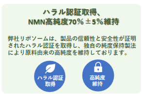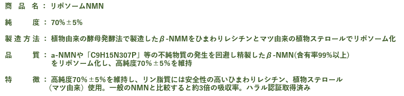 | 規格成分 | β-NMN(純度99%以上)をリポソーム化。高純度70%±5%を維持。 |